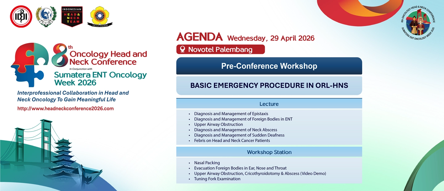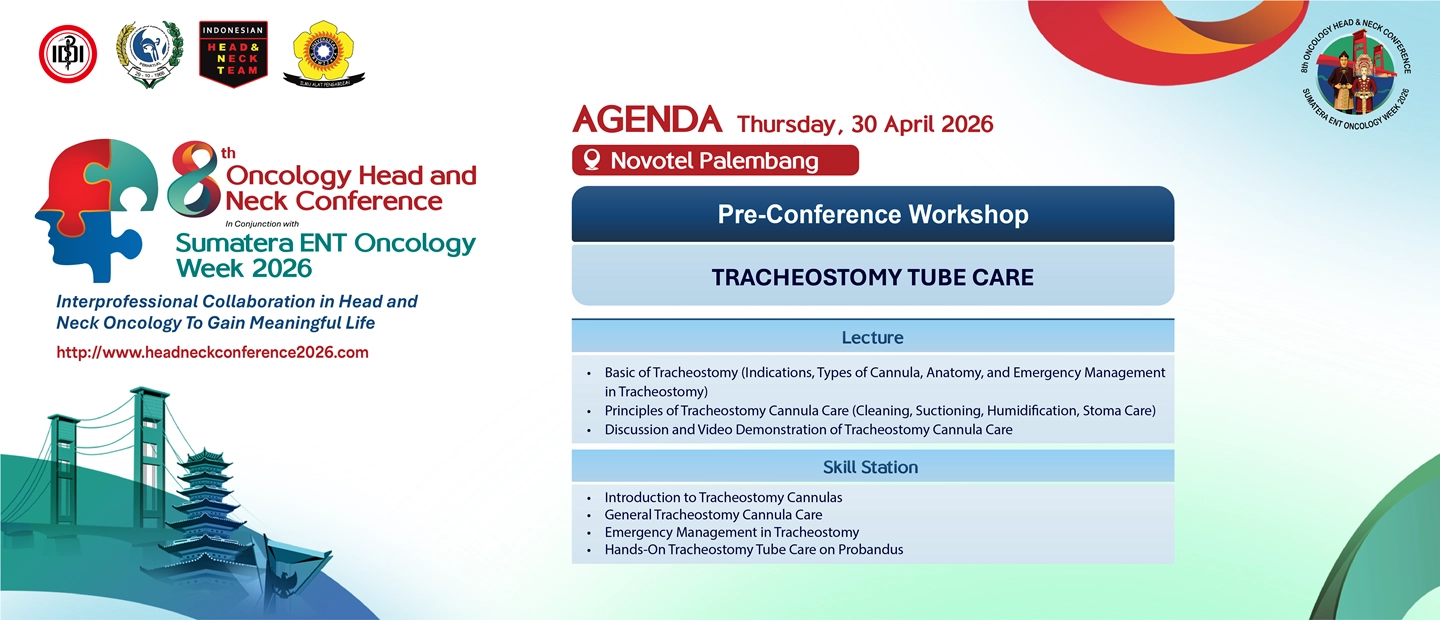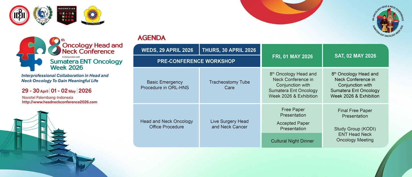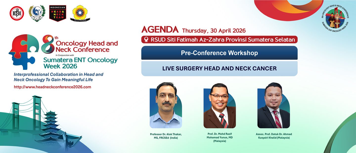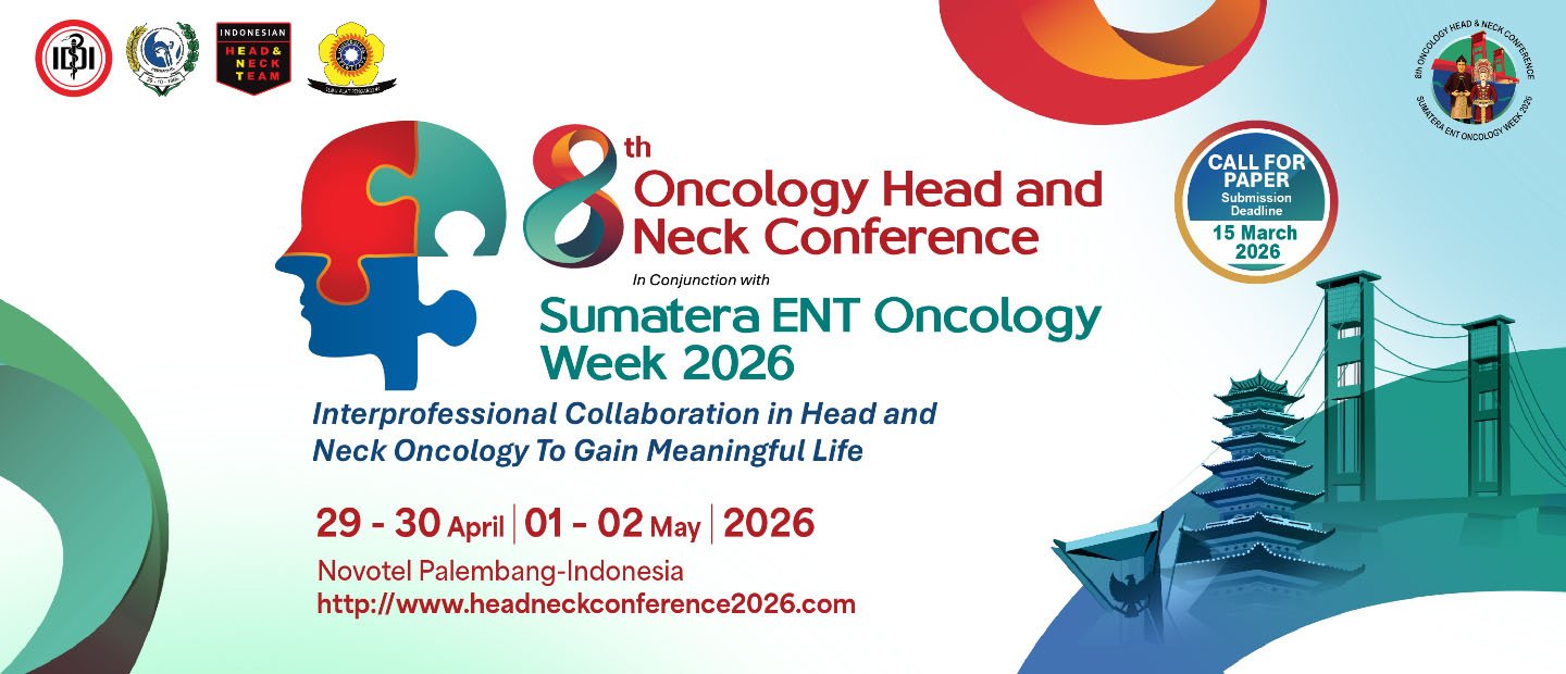 This national-scale scientific event the 8ᵗʰ Oncology Head & Neck Conference in conjunction with Sumatera ENT Oncology Week 2026 on 29-30 April, 01-02 May 2026 at Novotel Palembang, South Sumatera with the theme this year of “Interprofessional Collaboration in Head and Neck Oncology to Gain Meaningful Life,” reflects our strong commitment to advancing a comprehensive, patient-centered, and team-based approach in the management of head and neck cancer. Through shared expertise and strengthened collaboration among surgeons, clinicians, nurses, and allied professionals, we believe that the standard of care will continue to grow for the benefit of patients across Indonesia.